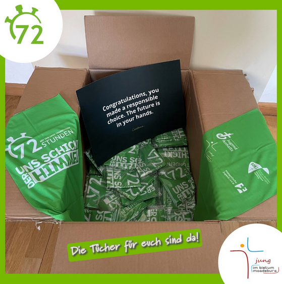 Der Countdown läuft, in zwei Tagen geh es los. Die Tücher für die Teilnehmer*innen der 72-Stunden-Aktion sind da und wir bringen sie mit, wenn wir euch besuchen und an einige gehen sie heute noch mit der Post raus.