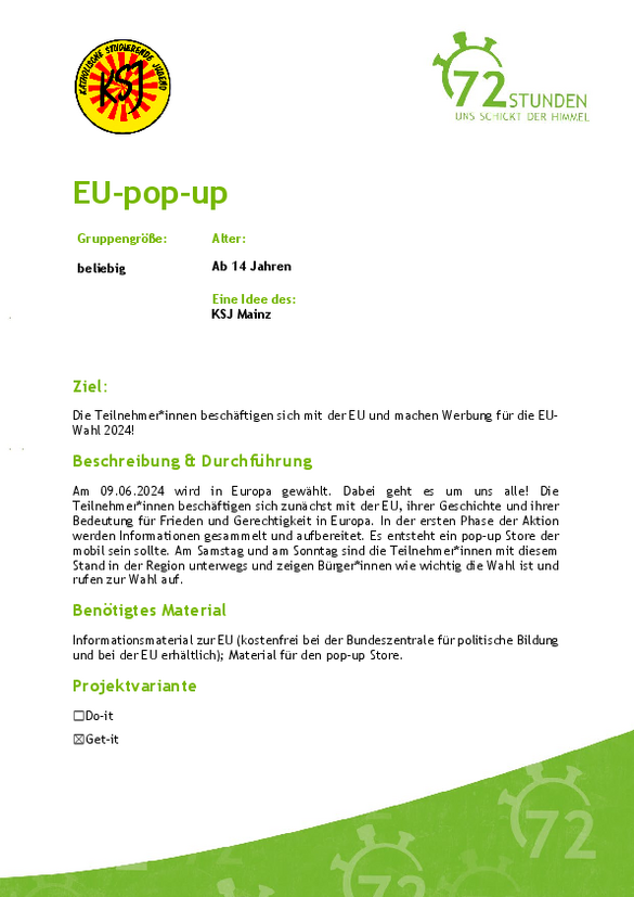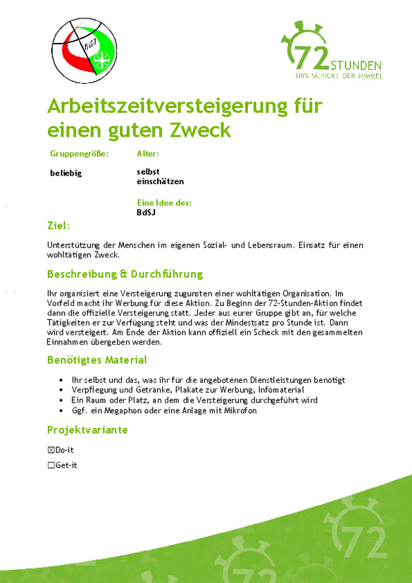 ... keine Zeit zur Vorbereitung habt könnt ihr euch für ein Get-It-Projekt anmelden. Hier wird euer 72-Stunden-Projekt inhaltlich für euch vorbereitet und ihr organisiert nur den Rahmen (Anmeldungen einsammeln, Aufsichtspflicht, Treffpunkte) selbst. Ein Get-It-Projekt soll und wird euch nicht überfordern, sondern eine niedrigschwellige Aktionsidee darstellen.